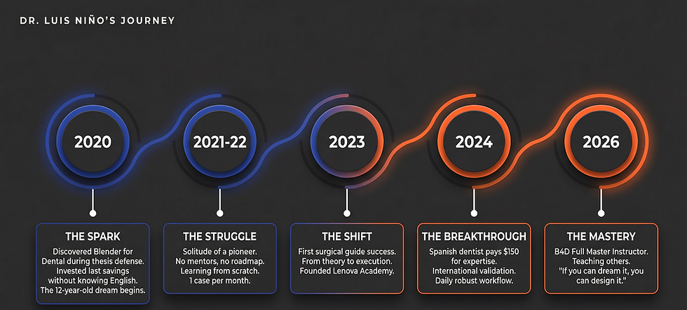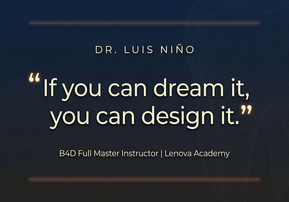 Dr. Luis Niño's journey is one we felt compelled to share—not because it follows the expected path, but because it defies it. From investing his last savings into B4D modules without knowing English, to founding Lenova and becoming a leader in full-arch digital workflows, Luis embodies the spirit of human-led digital dentistry. His story speaks to clinicians afraid of losing control, designers overwhelmed by complexity, and anyone brave enough to believe that the computer could be their primary tool. In his own words, Luis shares the moments that transformed him from a traditional dentist into a designer of digital solutions.